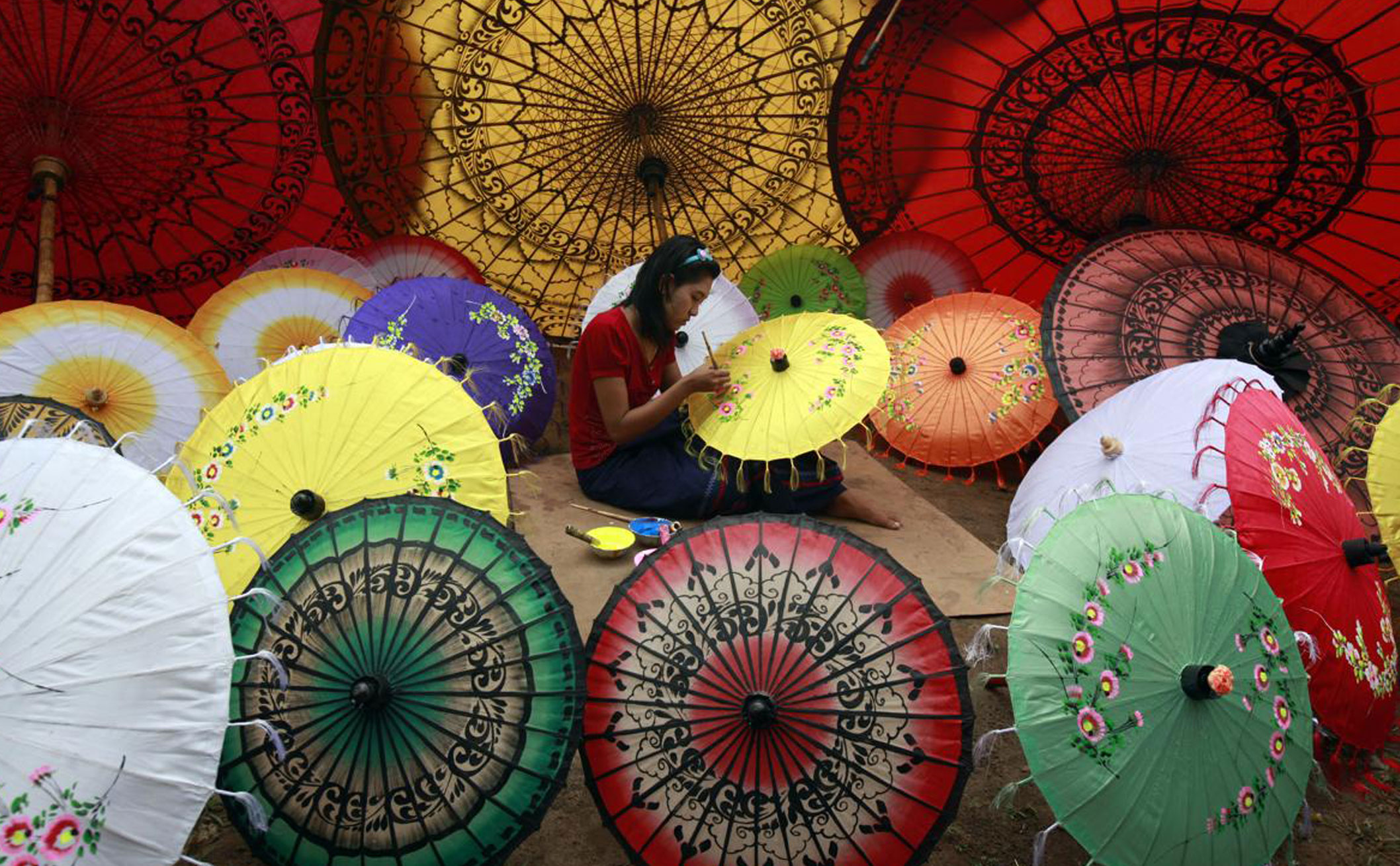 勃生傘得名于緬甸勃生市,這些傘由當(dāng)?shù)厝税垂欧ㄊ止ぶ谱鳎仟?dú)特的藝術(shù)紀(jì)念品。